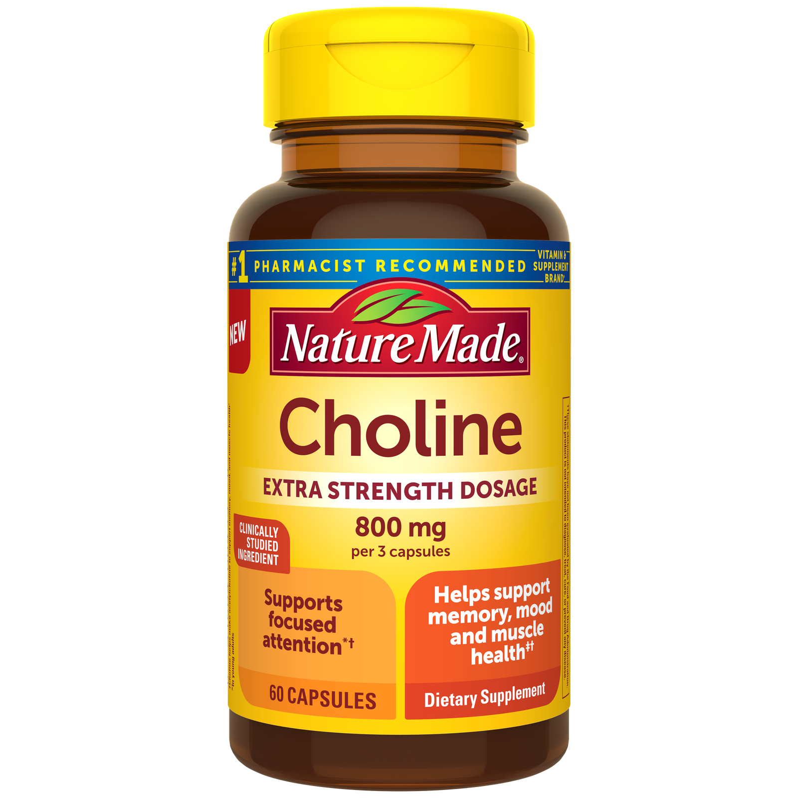 Looking to help support memory, mood, and muscle health?‡ Check all three boxes with Nature Made® Extra Strength Dosage Choline Capsules providing 800 mg Choline (per 3 capsules). This clinically studied ingredient supports focused attention★, making it a great addition to your morning routine.†